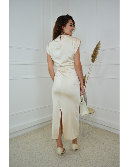 Élégante et indémodable, cette robe longue beige sans manches est idéale pour une allure sophistiquée et structurée.