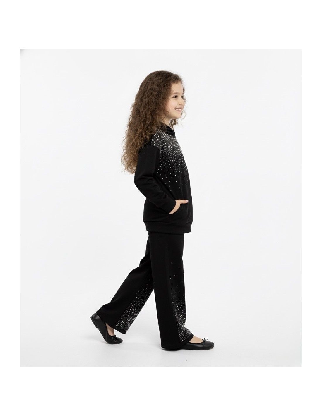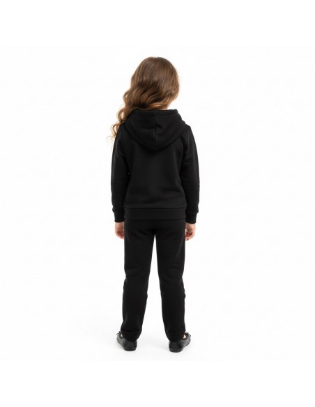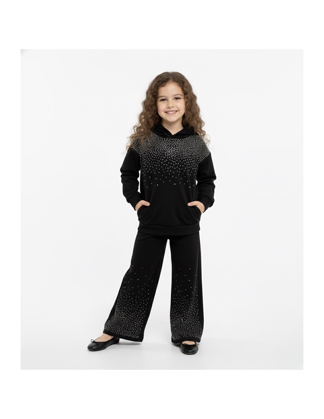 Cet ensemble enfant combine style, confort et une touche de brillance grâce à ses détails en strass. Le sweat à capuche, fluide et agréable à porter, est orné de strass sur l’avant, apportant une note chic et tendance. Il possède également une poche kangourou – la grande poche frontale pratique pour garder les mains au chaud ou ranger de petits objets.
