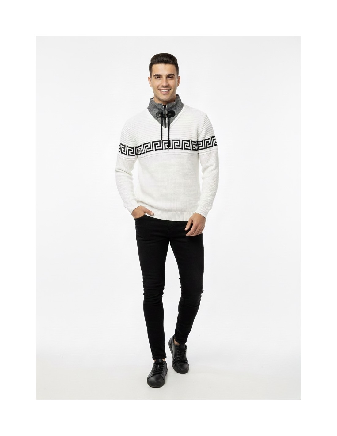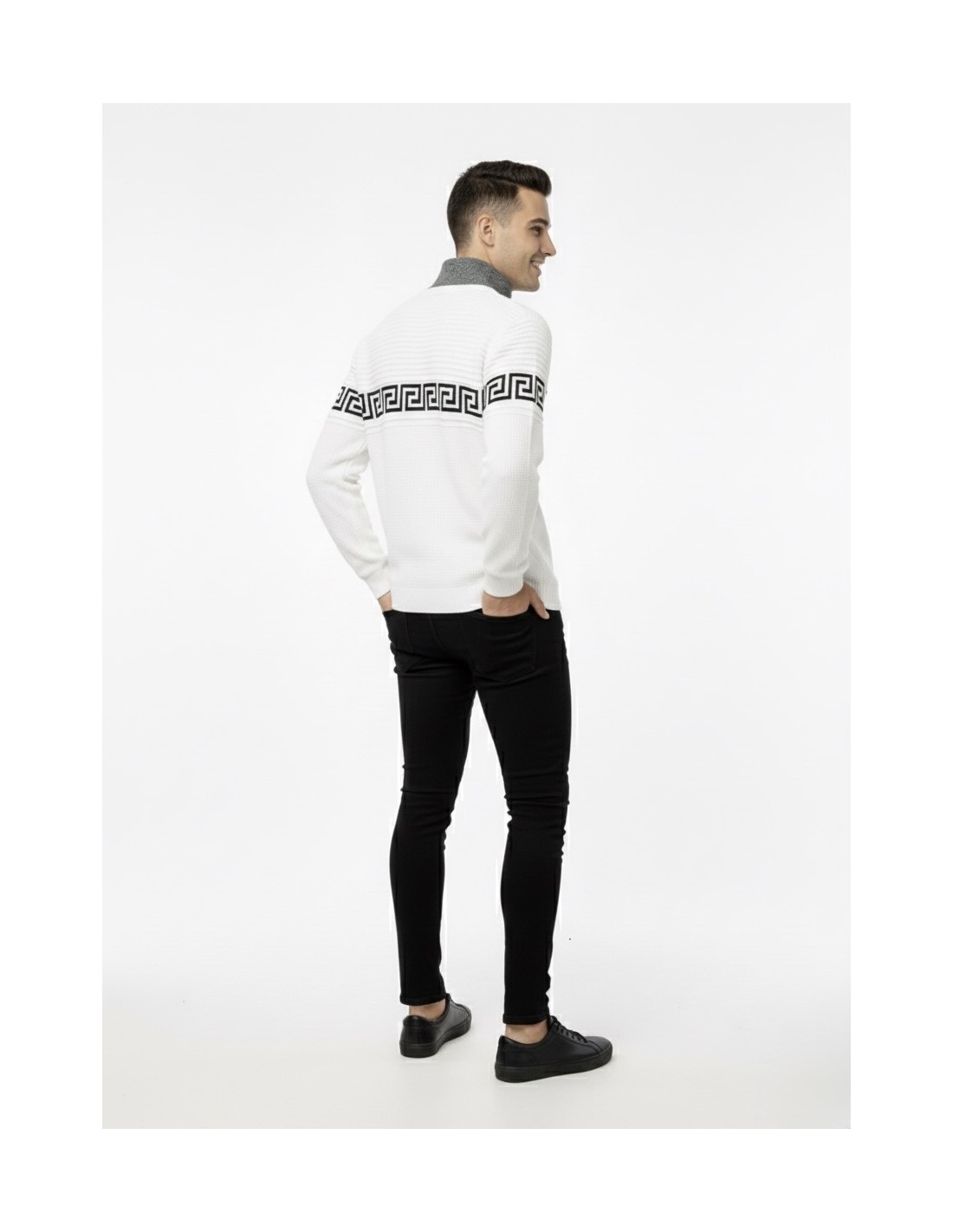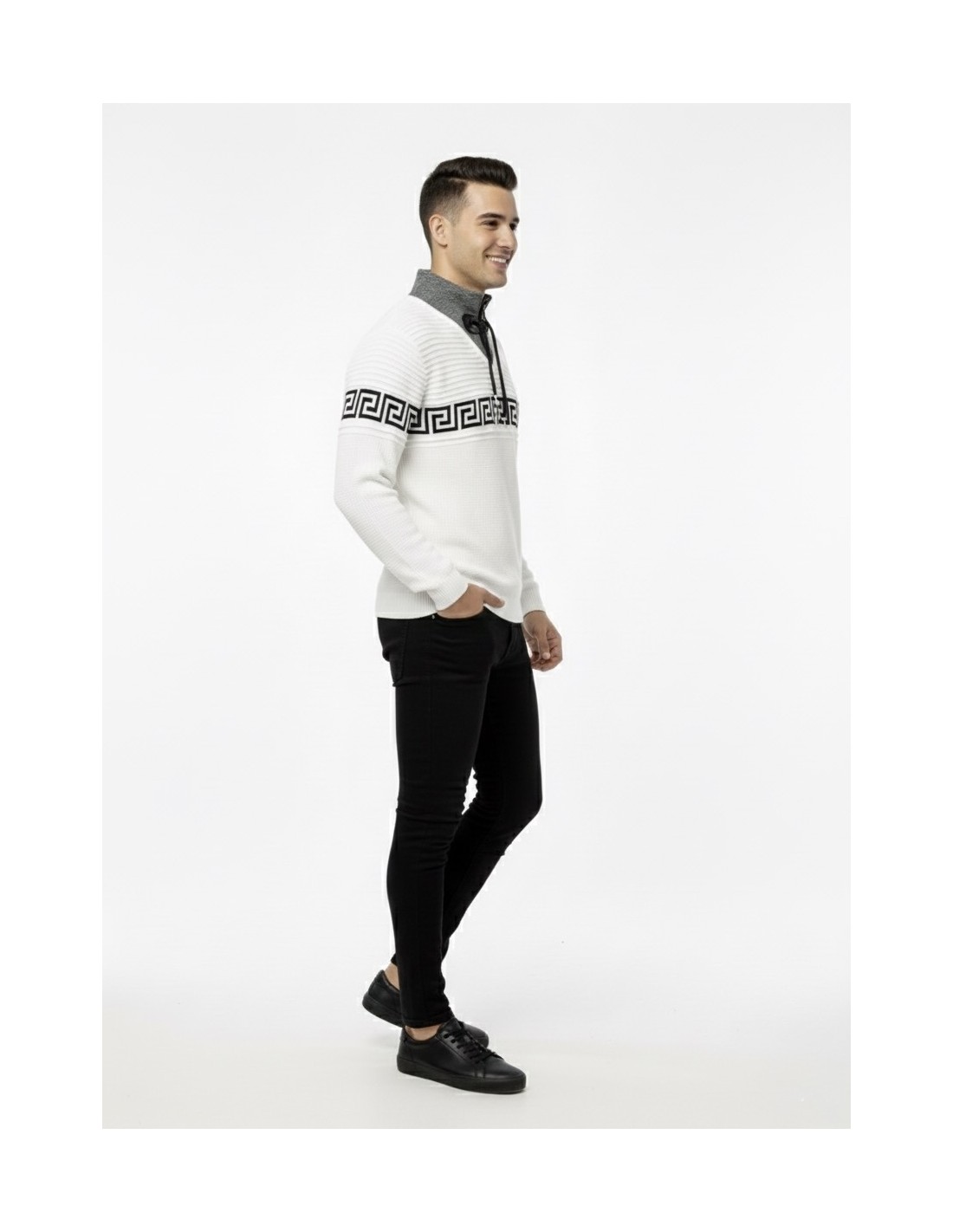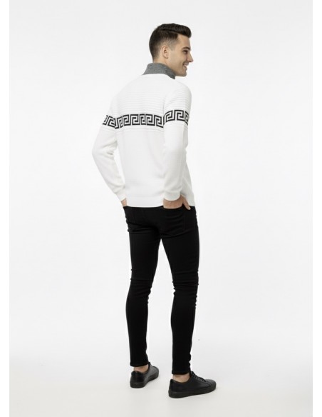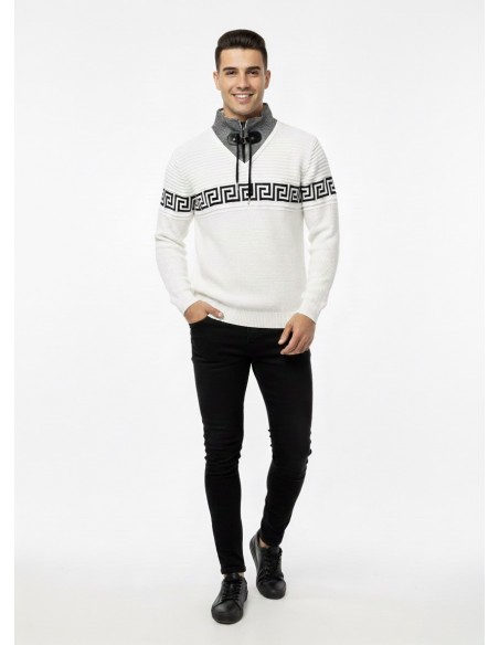 Pull Blanc à Col Montant Gris Motif Noir - HOMME