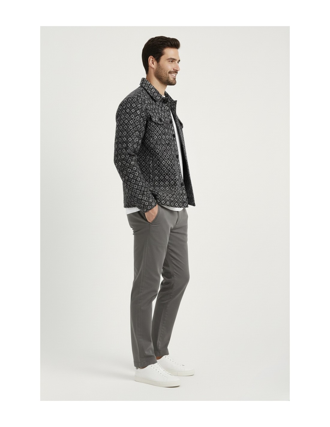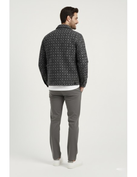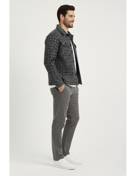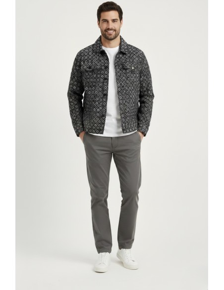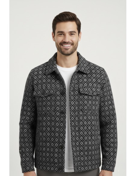 Cette veste homme à manches longues se distingue par son motif gris et noir, apportant style et modernité à votre silhouette. Son col revers et sa fermeture zippée offrent une allure soignée tout en permettant un porté pratique et décontracté.