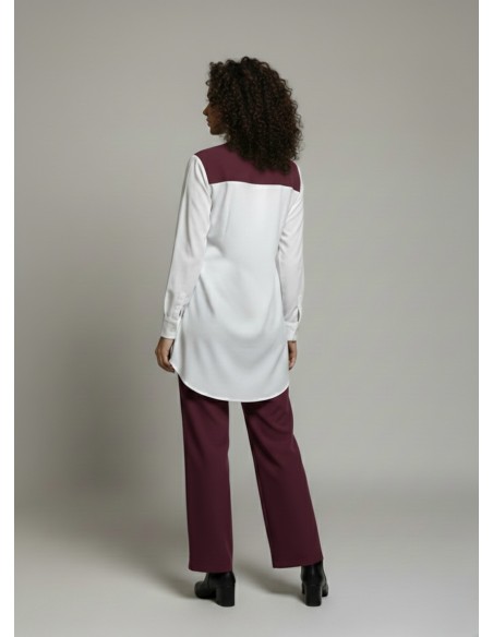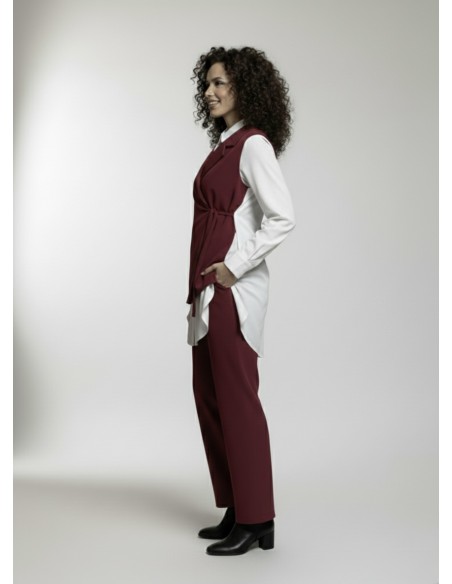 Cet ensemble femme se distingue par son design élégant et structuré, associant une chemise blanche à manches longues et un gilet bordeaux intégré, directement accroché à la chemise pour un effet superposé maîtrisé. Le lien à nouer sur le côté permet de cintrer la silhouette tout en apportant une touche raffinée.