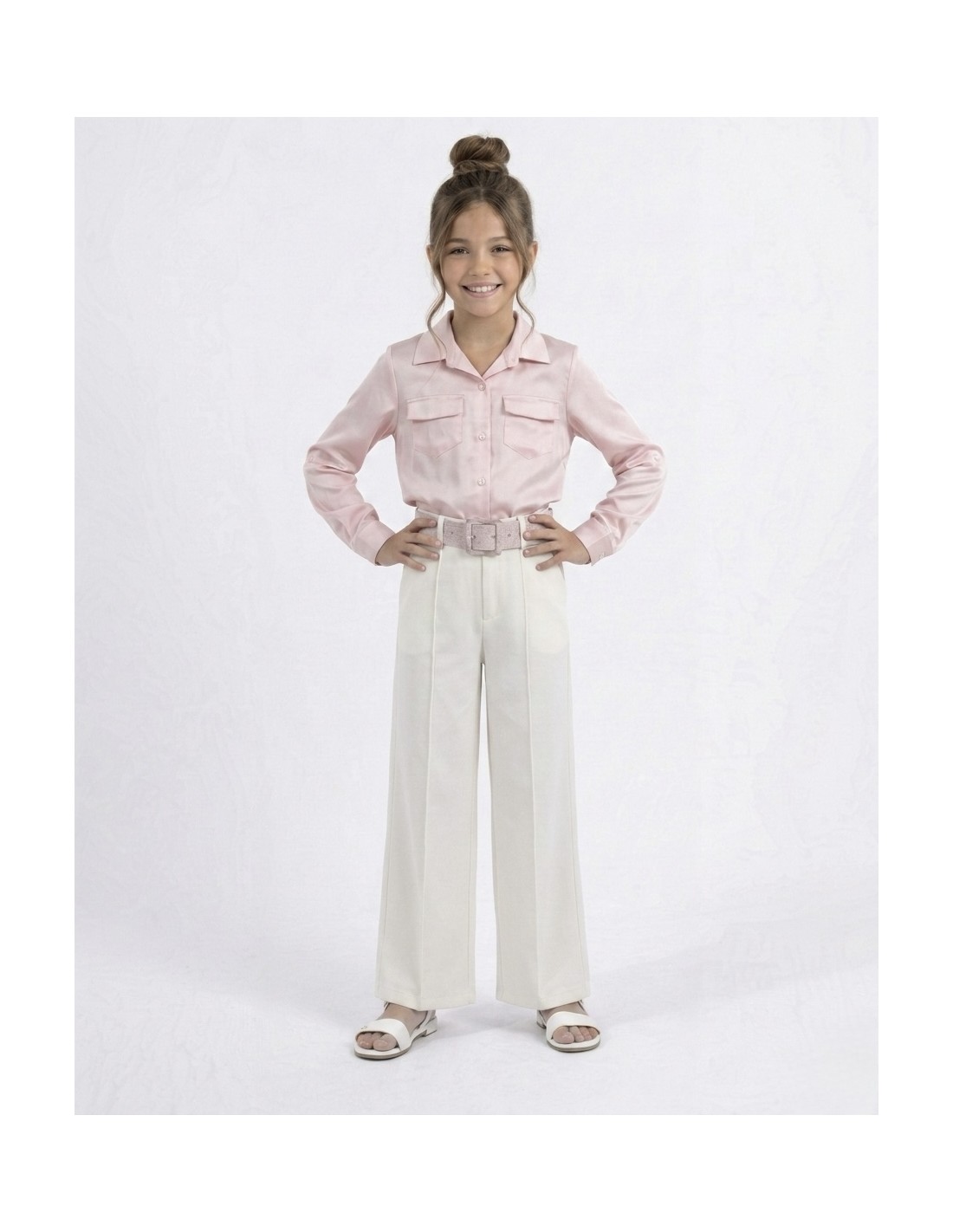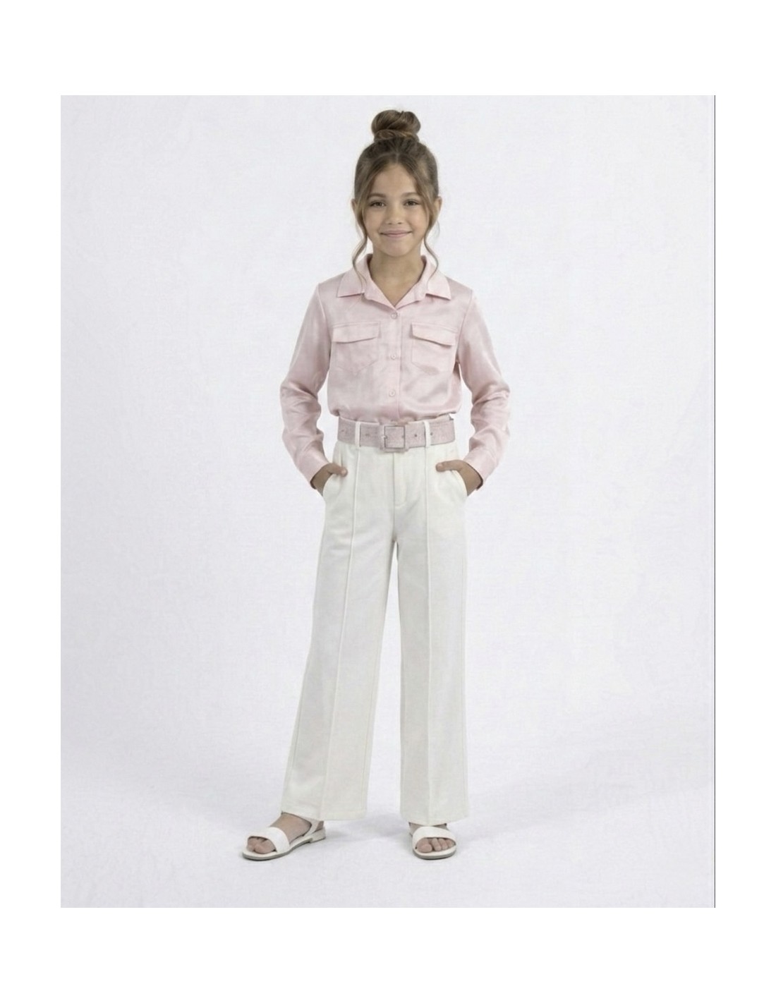 Ensemble rose chemise satinée + pantalon droit ceinturé – FILLE