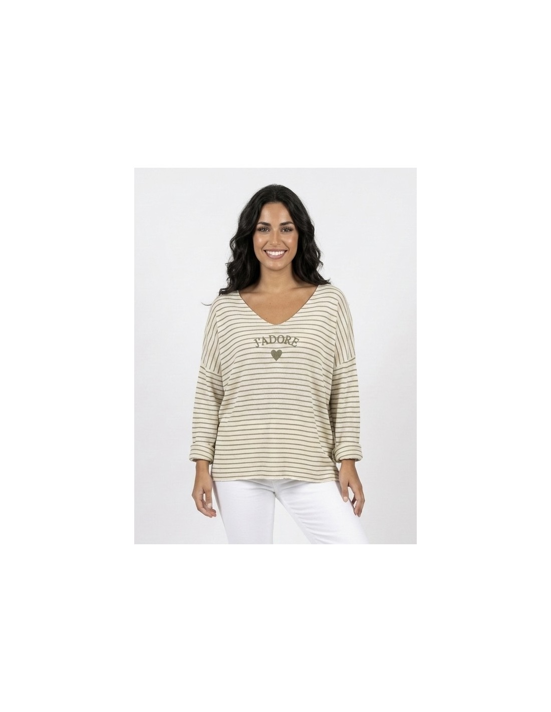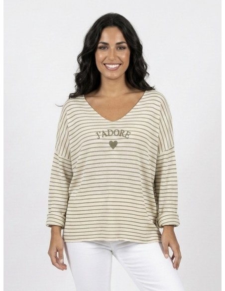 PULL RAYÉ "J’ADORE" VERT KAKI - FEMME