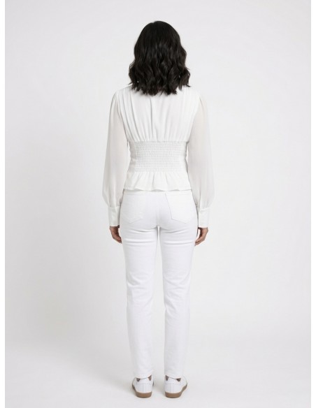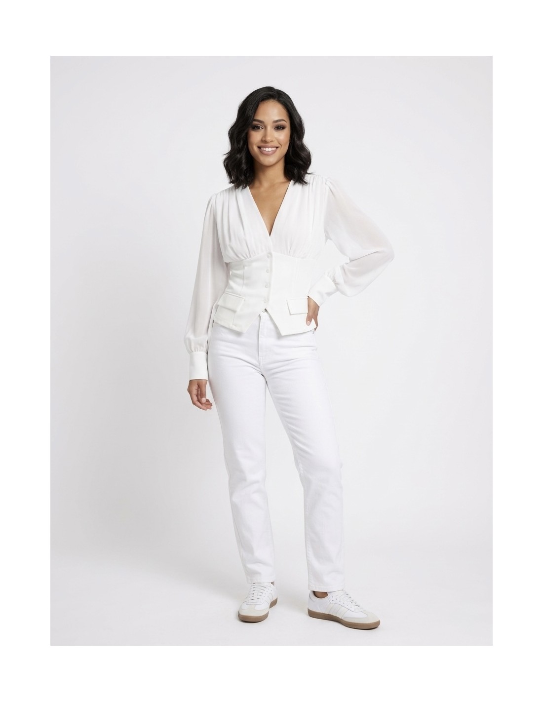 Cet ensemble femme se distingue par son design élégant et structuré, associant une chemise blanche à manches longues et un gilet noir intégré, directement accroché à la chemise pour un effet superposé maîtrisé. Le lien à nouer sur le côté permet de cintrer la silhouette tout en apportant une touche raffinée.