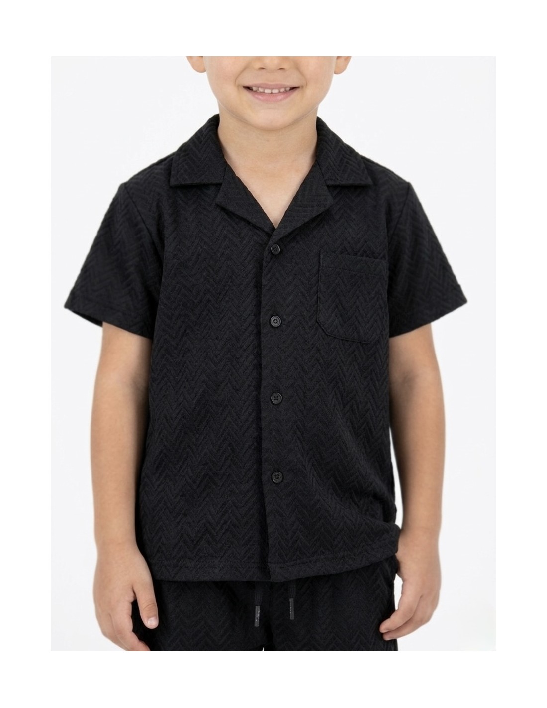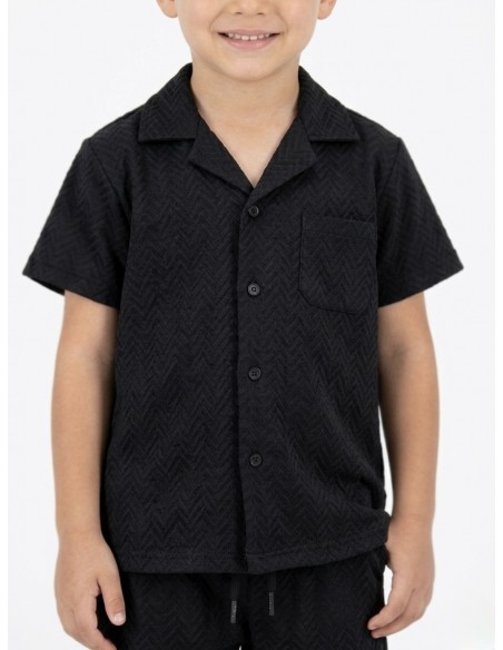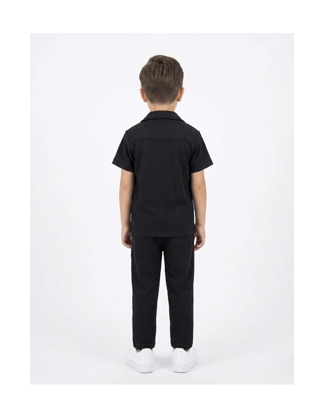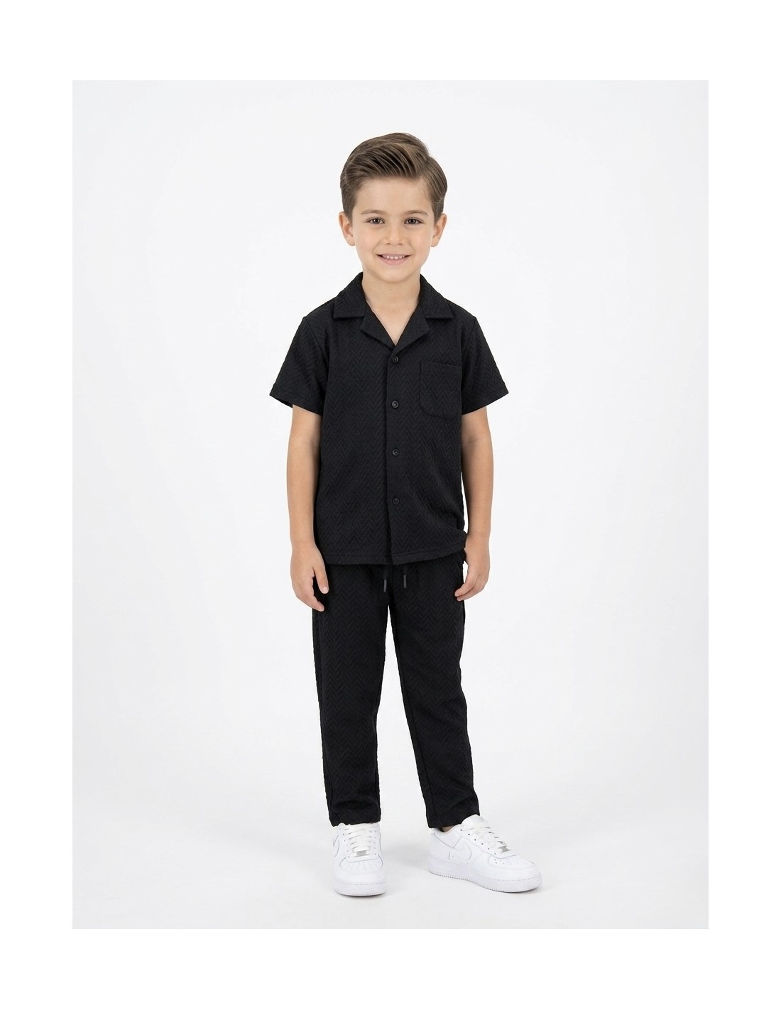 Cet ensemble garçon noir séduit par son élégant motif texturé en chevrons noir sur noir qui apporte du relief et du caractère à la tenue. La chemise à manches courtes avec col classique et poche poitrine offre un style à la fois soigné et moderne. Le pantalon jogging assorti, doté d’une taille élastiquée, assure un confort optimal et une grande liberté de mouvement.