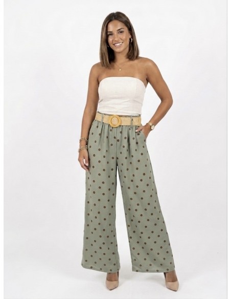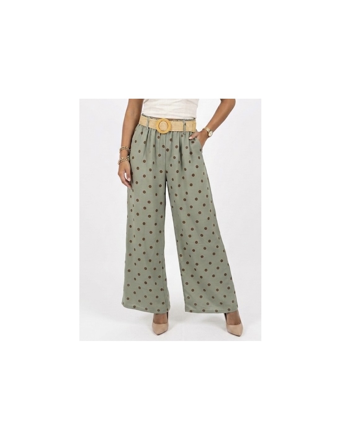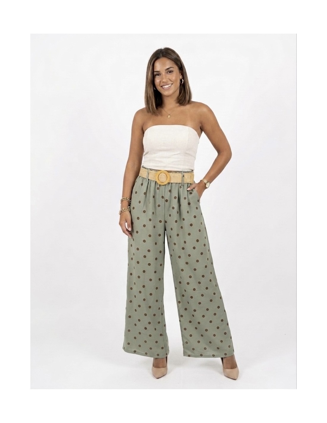 PANTALON LARGE VERT À POIS AVEC CEINTURE - FEMME