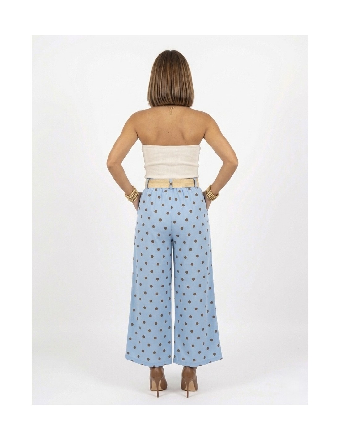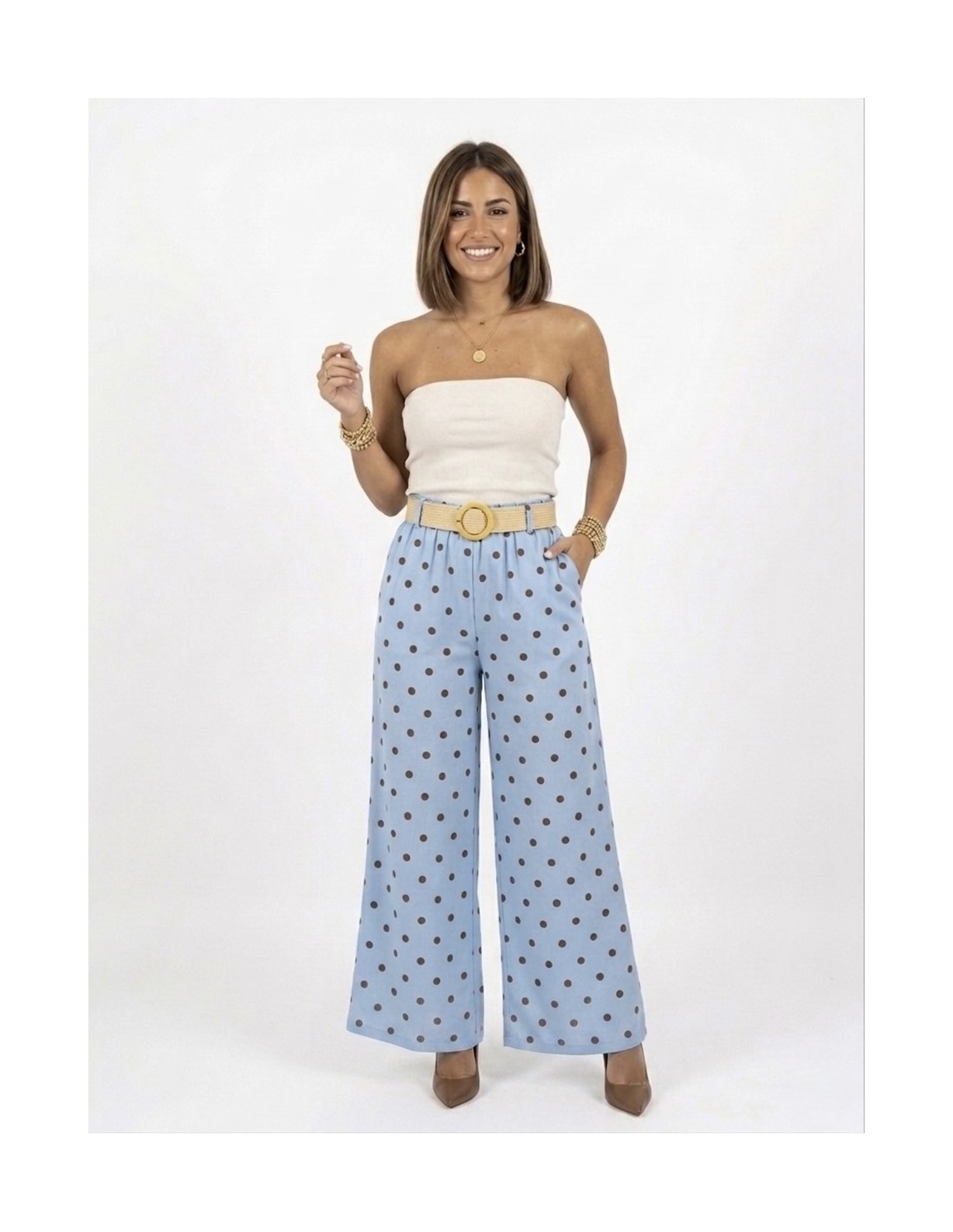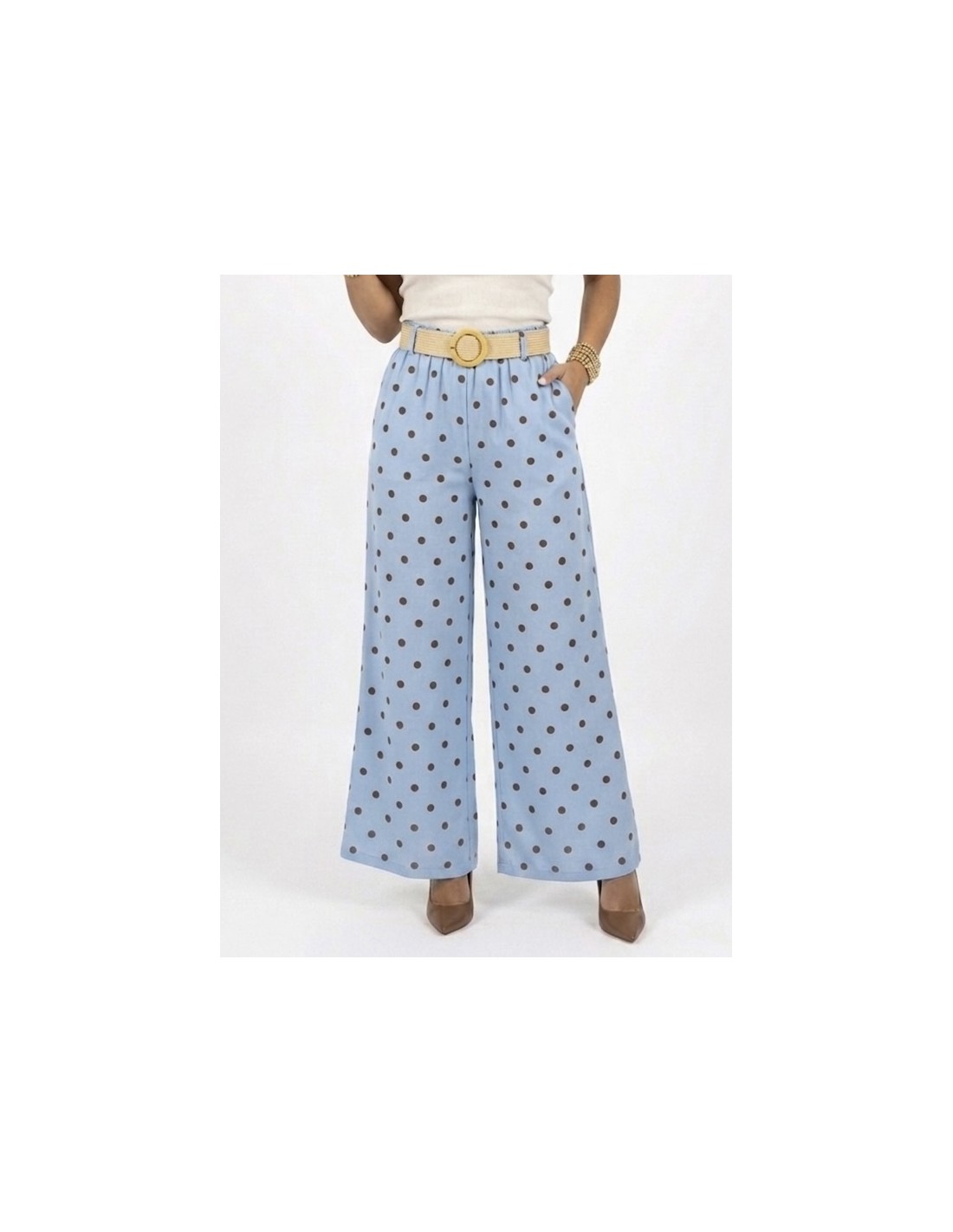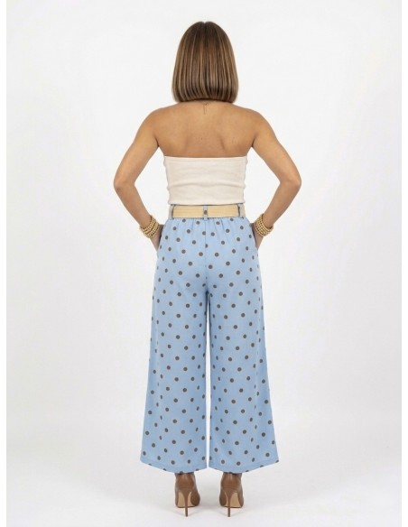 PANTALON LARGE bleu À POIS AVEC CEINTURE - FEMME