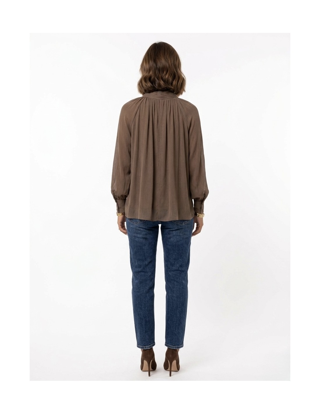 BLOUSE MARRON COL LAVALLIÈRE COUPE FLUIDE & DÉTAILS FRONCÉS - FEMME