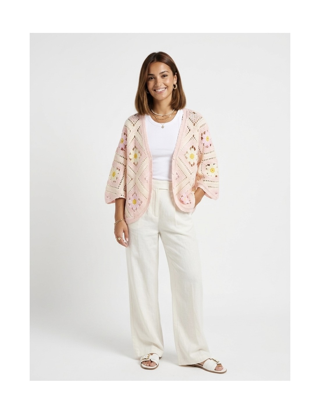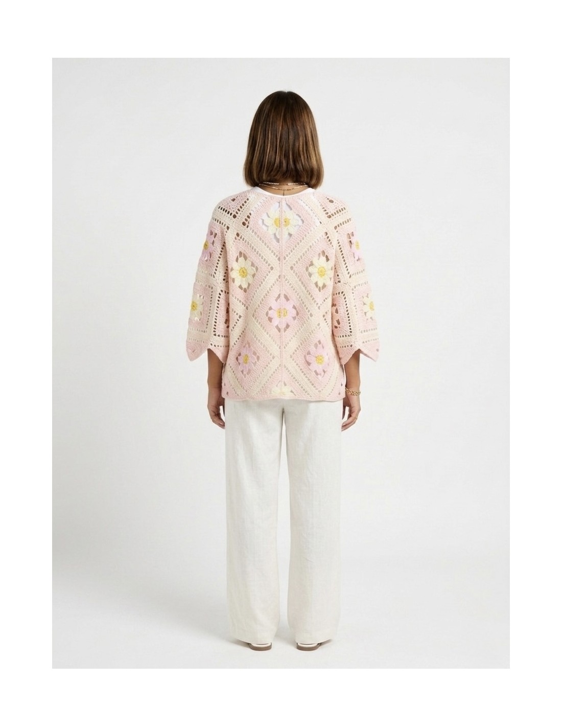 GILET ROSE EN CROCHET MOTIFS FLEURS - FEMME