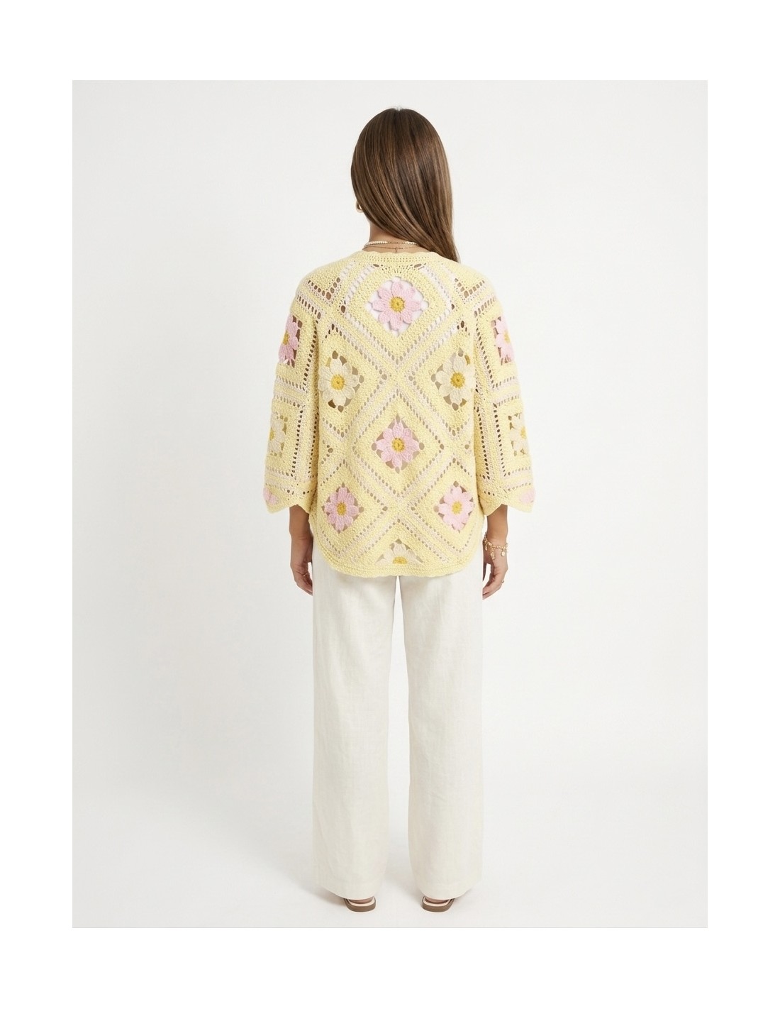 GILET JAUNE EN CROCHET MOTIFS FLEURS - FEMME