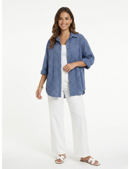 Cette chemise pour femme séduit par son élégante broderie anglaise et son design intemporel, offrant un look à la fois romantique et moderne. Sa coupe oversize et ses manches 3/4 assurent un confort optimal tout en apportant une allure fluide et aérienne. Les détails ajourés aux motifs floraux ajoutent une touche de sophistication tout en restant discrets.